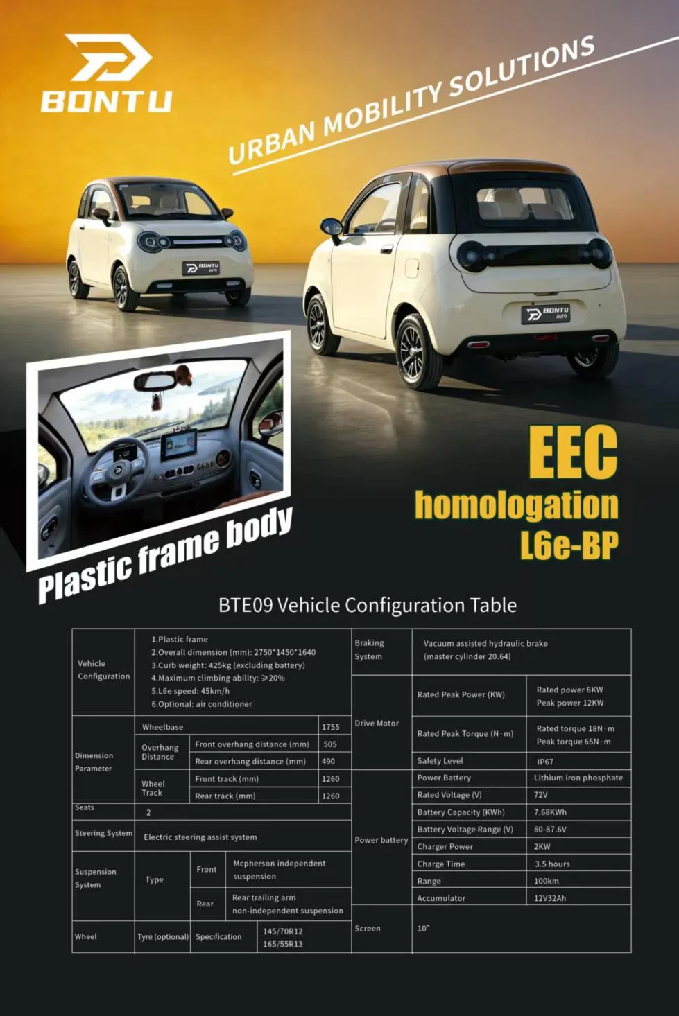 Shandong Bentu New Energy Vehicle Industry Co., Ltd. tuo markkinoille uuden BTE 09 MINI -henkilöauton, joka tarjoaa monipuolisen ja tehokkaan ratkaisun kaupunkiliikenteeseen. Tämä kestävällä muovirungolla suunniteltu kompakti ajoneuvo on kooltaan 2750 mm * 1450 mm * 1640 mm, joten se sopii erinomaisesti kapeille kaduille, ruuhkaisille keskusta-alueille ja ahtaille pysäköintipaikoille. Sen kompakti koko ei heikennä suorituskykyä: 20 %:n nousukaltevuuden ansiosta se kulkee helposti maanalaisilla autotallin rampeilla ja esikaupunkialueilla.